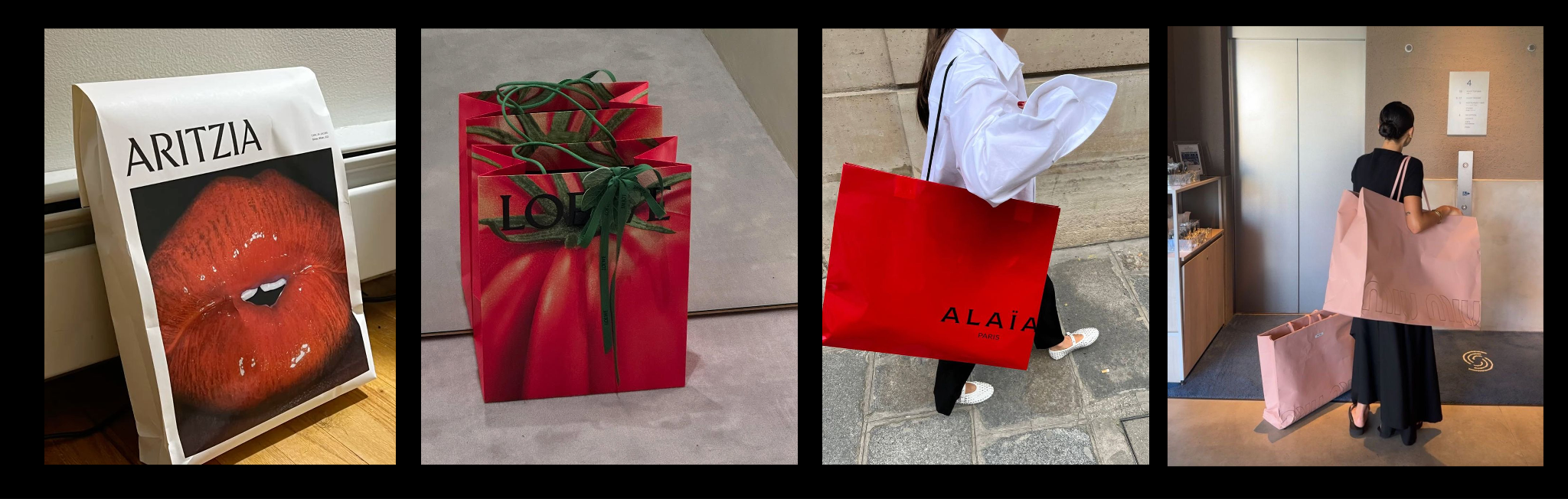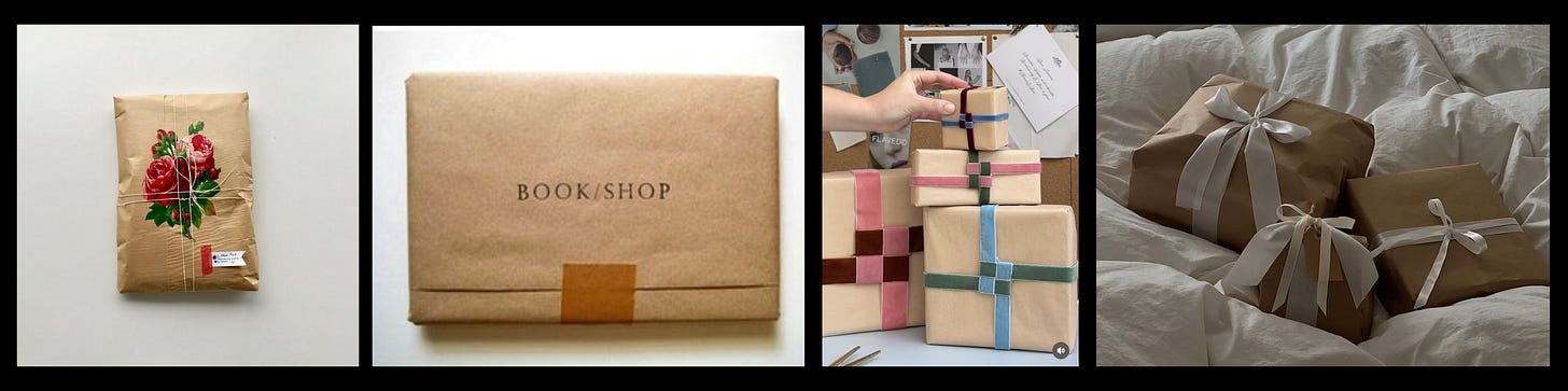 From brown paper to well-crafted and designed shopping bags (some favorites above: Aritzia, Loewe, Acne Studios) gift packaging can easily be done with a bag and some twine. Instead of letting them sit unused or end up in recycling, they can be repurposed to hold gifts. No overthinking needed.