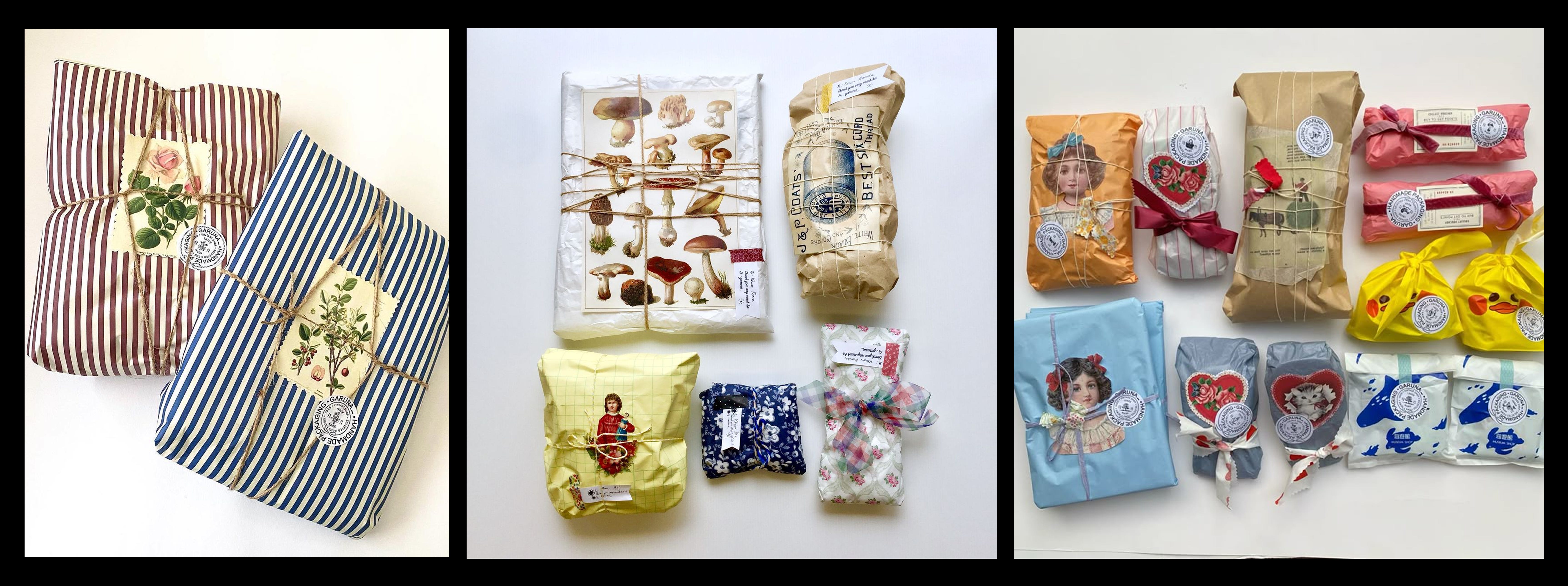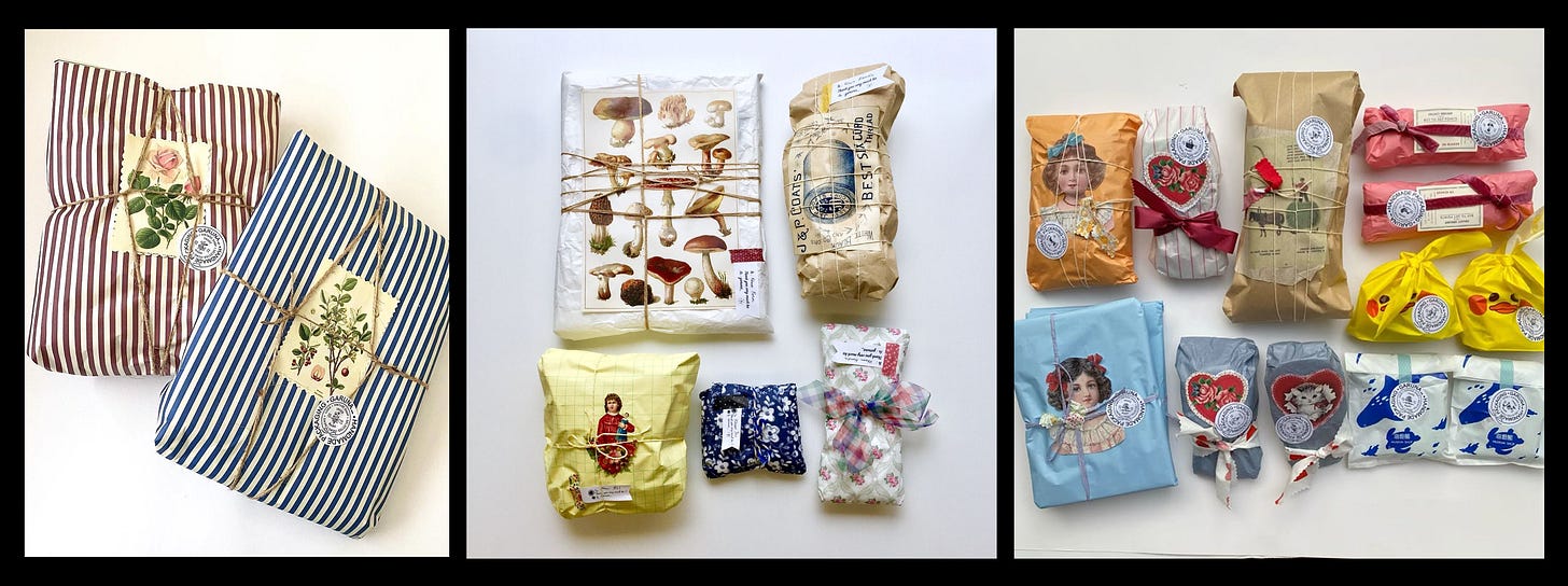 I call this a magical assortment because the small parts of the packaging above may seem random (this and that), but when you thoughtfully bring them together playing with colors, textures and patterns, the packaging magically comes together to be unexpectedly harmonious. I especially like the idea of visiting used bookstores for old magazines, or saving little paper trinkets from your travels.