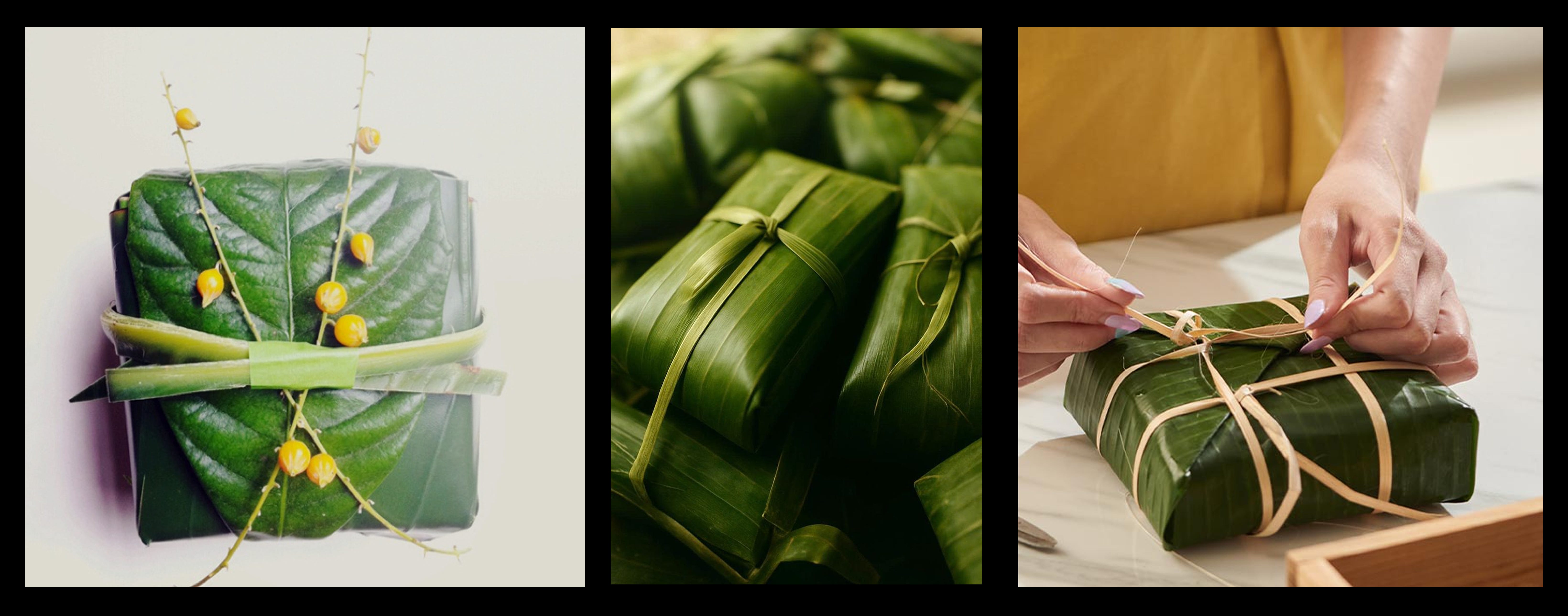 Sorry, I totally know this is not feasible if you don’t live in an environment that has banana leaves easily at hand which is probably most of us! But on the off chance you do, banana leaves are a natural and biodegradable alternative with a nice glossy finish. Because the banana leaves are the main star, a simple ribbon or twine is needed to secure everything in place.